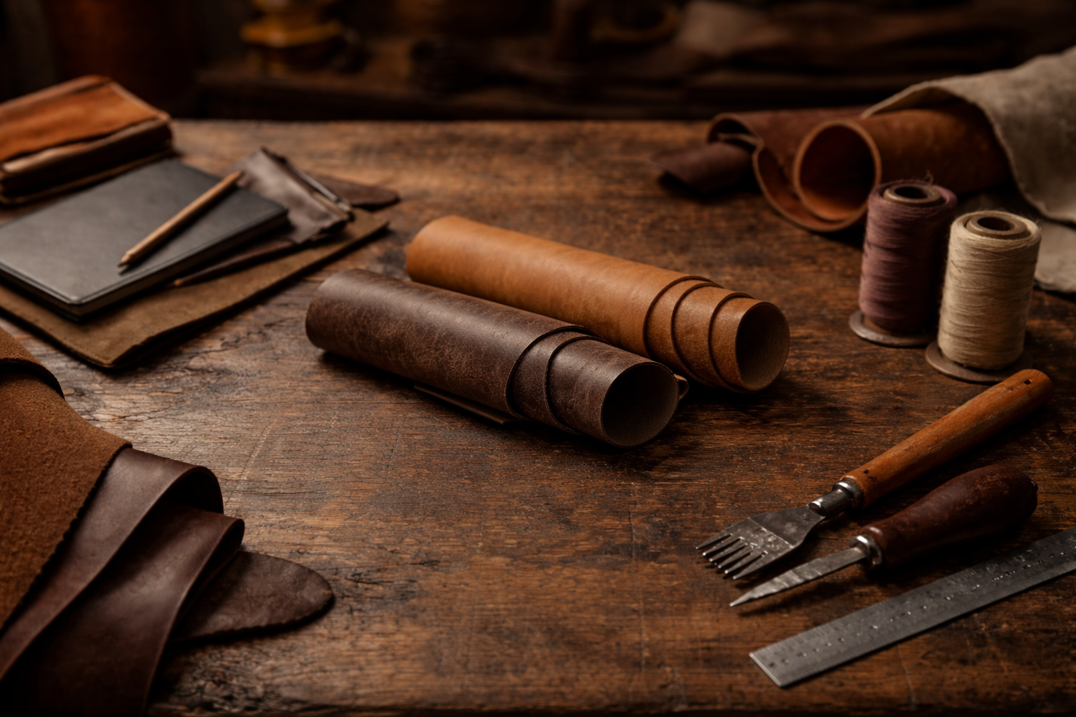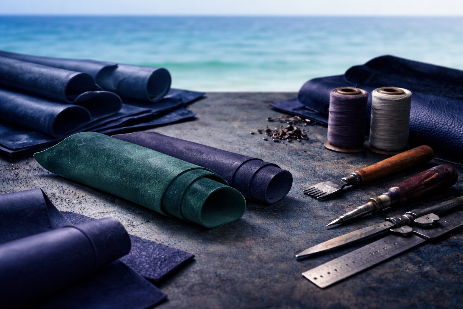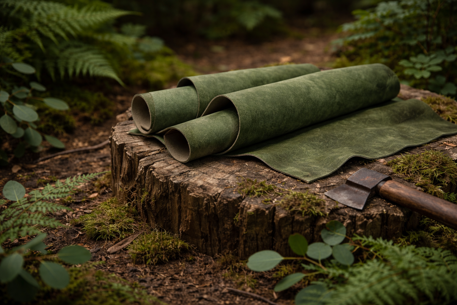 Calm and nature-inspired. With deep green and earthy olive tones, this leather has a slightly firm structure and a matte finish that softens with use. It offers a balanced, refined look with a subtle, organic feel.